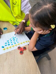 In maths in room 2, we focused on numbers during this activity. We read The Very Hungry Caterpillar and then completed a caterpillar worksheet where the children used their fingerprints to show the correct number and create a caterpillar. This activity helped us get a sense of what the students already know.